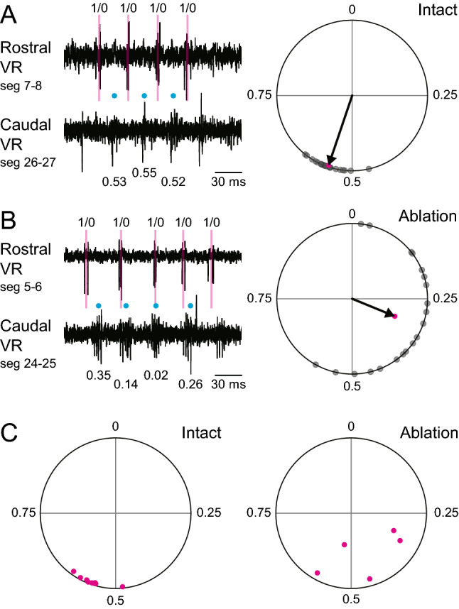 Anti-phasic relationship of the rostral and caudal motor activities is impaired in MCoD-ablated fish. (A) Left panel, An example of the dual (rostral and caudal) VR recordings. For the phase analysis, the middle time point of a rostral VR activity was assigned a phase value of 0, and that of the next VR activity was assigned a phase value of 1. Right panel, Circular plot of 20 randomly selected caudal VR activities with respect to rostral VR activity during fictive swimming. (B) Same as (A) but for MCoD-ablated fish. (C) Left panel, Circular plot for the recordings from intact fish (n = 8). Right panel, Circular plot for the recordings from MCoD-ablated fish (n = 5).
