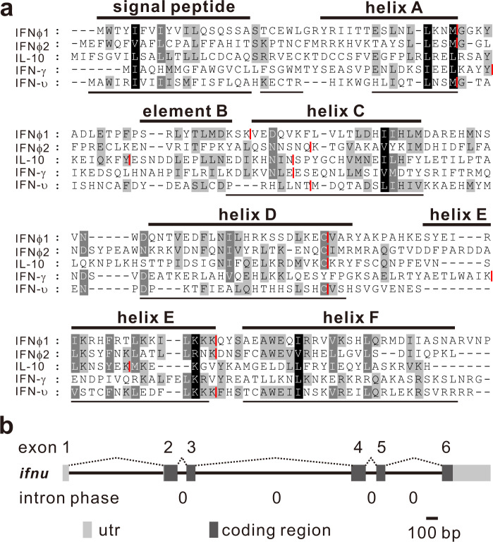 Fig. 1 a Sequence alignment of IFN-υ protein. Identical or similar amino acids are indicated in shade. The putative signal peptide and helices of IFN-υ are underlined and the known helices A to F for zebrafish IFNφ1 are highlighted by solid lines above the alignment. Intron positions are indicated in red line. b The gene organization of zebrafish IFN-υ. Exons and introns are indicated with gray boxes and lines, respectively. The intron phases of ifnu are all zero. The utr indicates untranslated regions.
