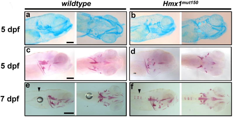 Figure 2 Precocious vertebral bone development in hmx1mut150 zebrafish embryos: Cartilage structures stained with alcian blue in wildtype and hmx1mut150 embryos (a,b) at 5 dpf; the developing cranial cartilage structures develop properly in hmx1-mutant embryos. Cranial bone structures stained with alizarin red in wildtype and hmx1mut150 at 5 and 7 dpf (c,f). Wildtype and hmx1mut150 cranial bones developed regularly at 5 dpf (c,d), while at 7 dpf early mineralization of the vertebrae was detected in hmx1mut150, similarly to hmx1mut10 embryos (e,f). Bar, (a–c) 250 μm; (e–f) 500 μm.