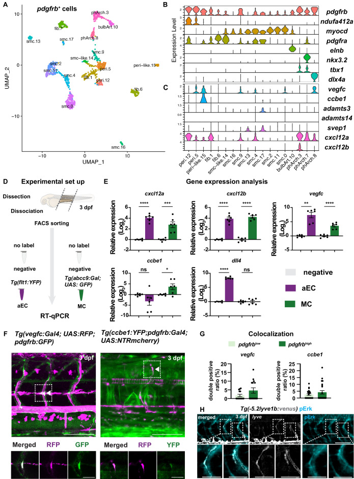 (A) Uniform Manifold Approximation and Projection (UMAP) plot of smooth muscle cells and pericytes subclustered from 5 days post fertilization (dpf) pdgfrb:egfp-positive cells. bulbArt – bulbous arteriosus, fib – fibroblast, peri – pericyte, peri-like – pericyte-like, phArch – pharyngeal arch mesenchymal cell, smc – smooth muscle cell. (B) Violin plot showing markers for pericytes (pdgfrb, ndufa4l2a), smooth muscle (myocd), fibroblasts (pdgfra), bulbous arteriosus (elnb), and pharyngeal arch mesenchyme (nkx3.2, tbx1, dlx4a). (C) Violin plot showing expression of known non-autonomous pro-lymphatic factors. Expression level values are log2 normalized across all cells. (D) Illustration of fluorescence activated cell sorting (FACS) and qPCR analysis on 3 dpf embryos. (E) qRT-qPCR of cxcl12a, cxcl12b, vegfc, ccbe1, and dll4 in FACS sorted trunk arterial endothelial cells (aECs) and MCs cells at 3 dpf as described in (D). Graph represents gene expression relative to geometric average of rpl13 and β-actin from three biological repeats (mean ± SEM). Unpaired two-tailed Student’s t-test or Mann-Whitney test was used. No significance (ns), p ≥ 0.5. *p < 0.05, ***p < 0.0005, ****p < 0.0001. (F) Confocal z-projections for immunohistochemistry of fluorescent proteins in trunks of Tg(vegfc:Gal4; UAS:RFP; pdgfrb:GFP) and confocal image of Tg(ccbe1:YFP;pdgfrb:Gal4; UAS:NTRmcherry) embryos at 3 dpf. Scale bar: 100 μm; 50 μm in enlarged images. (G) Left panel, quantification of colocalization of vegfc+ and pdgfrb+ cells based on immunohistochemistry in (F). Right panel, quantification of colocalization of ccbe1+ and pdgfrb+ cells based on confocal images in (F), data presented as double positive ratio (mean ± SEM). Ns, no significance. (H) Confocal z-projections for immunohistochemistry of endogenous pERK (cyan, right) in migrating lymphatic endothelial cells (LECs) in trunks of Tg(–5.2lyve1b:venus) embryos (α-GFP, grey, middle) (n = 10) at 3 dpf. Scale bar: 100 μm; 50 μm in enlarged images.