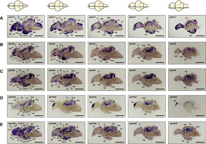 (A–E) opn4.1 (A) opn4a (B) opn4b (C) opn4xa (D) and opn4xb (E). A horizontal line through a representation of the brain, above the section, indicates the location of the section within the brain. The names and abbreviations of all brain domains in which opn4 is expressed are listed in Table
