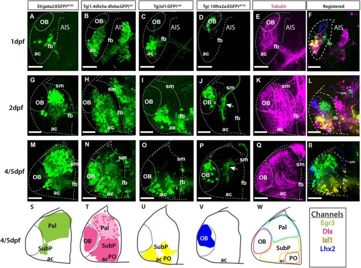 Atlas of transgene expression in the developing telencephalon: Lateral views. Et(gata2:EGFP)bi105 in comparison with Tg(1.4dlx5a-dlx6a:GFP)ot1, Tg(isl1:GFP)rw0, Tg(-10lhx2a:EGFP)zf176 and acetylated tubulin antibody staining. Lateral views of 1dpf, 2dpf and 4/5dpf fish stained against GFP (A–D,G–J,M–P) and acetylated tubulin (E,K,Q). Images are projections of confocal stacks. Rostral to the left. (N) 4dpf; (M,O–R) 5dpf. (S–W) Schematics showing the location of the GFP+ cells in the different transgenic lines. (W) Schematic showing all GFP+ domains. (F,L,R) Transgenic datasets registered to a single reference brain for each developmental stage, with the exception of 4dpf Tg(1.4dlx5a-dlx6a:GFP)ot1 which could not be registered to 5dpf data. Channels key below final column shows the color of each transgenic in the registered images and the schematics. Scale bars: 50 μm.