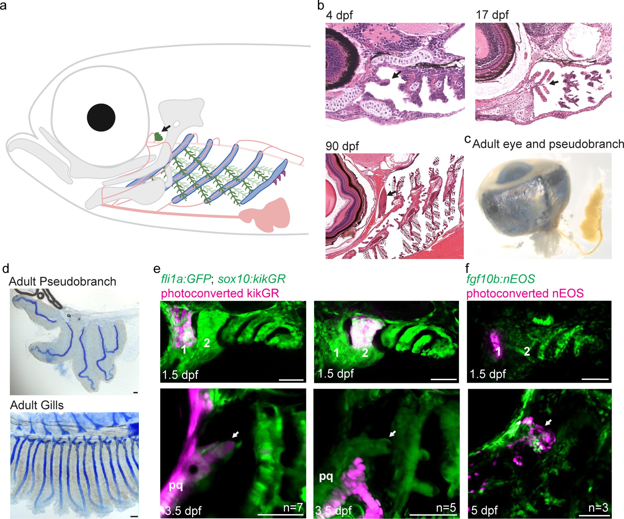 Fig. 1 The zebrafish pseudobranch derives from mandibular arch mesenchyme and first pouch epithelia. (a), Schematic showing the pseudobranch (arrows), gill filaments (branched green structures) connected to gill bars (blue), teeth (purple), vasculature (pink), and jaw and jaw-support skeleton (gray). (b) Hematoxylin and Eosin-stained sections show emergence of the pseudobranch bud at 4 dpf (adapted from https://bio-atlas.psu.edu/zf/view.php?atlas=5&s=41), five filaments at 17 dpf (adapted from https://bio-atlas.psu.edu/zf/view.php?atlas=65&s=1738), and the fused pseudobranch at 90 dpf (adapted from https://bio-atlas.psu.edu/zf/view.php?atlas=29&s=312). (c) Dissected adult pseudobranch shows the ophthalmic artery connecting it to the eye. (d) Alcian staining shows five cartilage rods in the pseudobranch and similar cartilage in gill primary filaments. (e) Photoconverted kikGR-expressing mesenchyme (red) from the dorsal first arch (numbered) at 1.5 dpf contributes to the palatoquadrate cartilage (pq) and pseudobranch mesenchyme (arrow) at 3.5 dpf. Photoconverted dorsal second arch cells do not contribute to the pseudobranch. In green, fli1a:GFP labels the vasculature and neural crest-derived mesenchyme, with mesenchyme also labeled by unconverted sox10:kikGR. (f) In fgf10:nEOS embryos, photoconversion of first pouch endoderm (numbered) at 1.5 dpf labels the pseudobranch epithelium (arrow) at 5 dpf. n numbers denote experimental replicates in which similar contributions were observed. Scale bars, 50 µm.