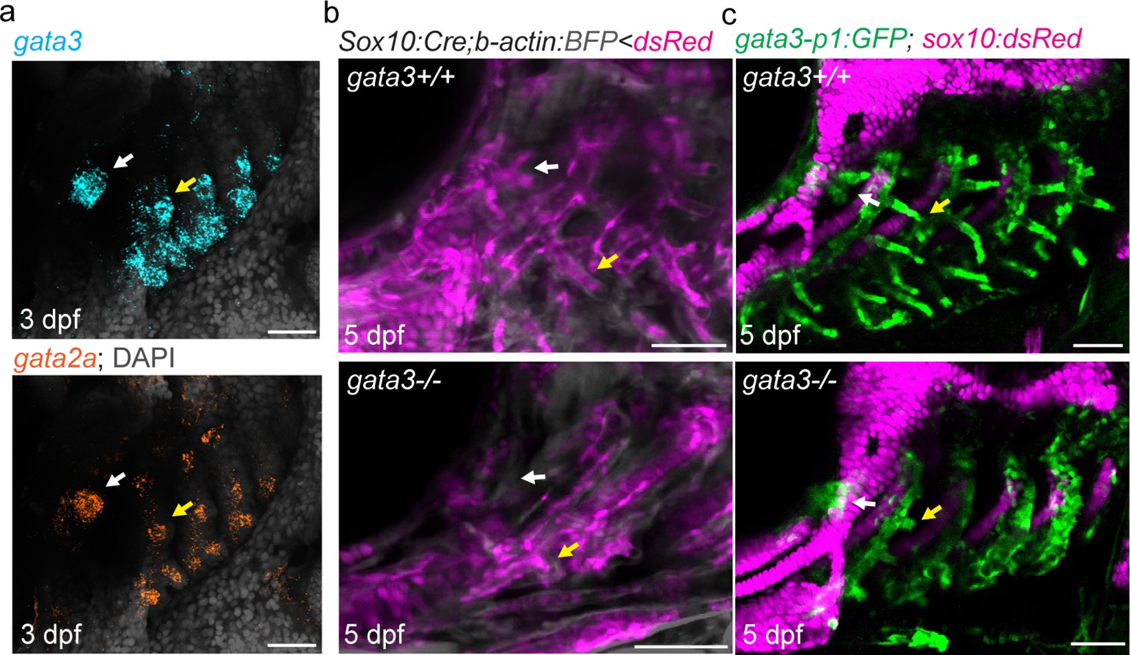 (a) Similar expression of gata3 and gata2a in developing pseudobranch (white arrows) and gill regions (yellow arrows). (b) Sox10:Cre; acta2:loxP-BFP-Stop-loxP-dsRed labels Cre-converted dsRed+ neural crest-derived mesenchyme (magenta) and unconverted BFP+ epithelia (gray). (c) gata3-p1:GFP labels pseudobranch and gill filament buds, and sox10:dsRed labels cartilage. For both (b) and (c), 3/3 gata3 mutants displayed reduced formation of the pseudobranch (white arrows) and gill filaments (yellow arrows), compared to 3 controls each. Scale bars, 50 µM.