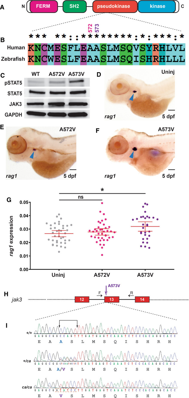 Conservation of human JAK3 constitutively-activating mutations in zebrafish. A JAK3 structure. Schematic representation of JAK3 including the FERM (pink), SH2 (green), pseudokinase (red) and kinase (blue) domains, which are all present in zebrafish Jak3. B Conservation of human and zebrafish JAK3. Human JAK3 and zebrafish Jak3 were aligned using CLUSTALX, showing identical (*) and highly similar (:) residues around A572/A573. C Analysis of zebrafish Jak3 mutants in vitro. Western blot analysis of HEK293 cells transfected with wild-type Jak3 + Stat5.1 (WT), Jak3 A572V + Stat5.1 (A572V) and Jak3 A573V + Stat5.1 (A573V) using anti-phospho-STAT5 (pSTAT5), anti-STAT5, anti-HA (JAK3) and anti-GAPDH antibodies, as indicated. D–G Analysis of zebrafish Jak3 mutants in vivo. Uninjected (Uninj) embryos (D) or those injected with mRNA encoding Jak3 A572V (E) or A573V (F), were subjected to WISH with rag1 and imaged, with representative embryos shown. The area of rag1 expression was determined for individual embryos (G) with mean and SEM shown in red and level of statistical significance indicated (*p < 0.05, ns: not significant; n = 30) (6.3 × magnification, scale bar = 100 μm). H Genome targeting of zebrafish jak3. Exon–intron structure of the target site with spanning primers (F, R) indicated by black arrows, with exons encoding the pseudokinase domain shown as numbered boxes and introns represented as solid lines, with the Jak3 A573V mutation denoted by a purple arrow. I The jak3 constitutively activating (ca) mutant alleles generated in zebrafish. The nucleotide sequence of homozygote wild-type (+/+), along with heterozygote (+/ca) and homozygote (ca/ca) mutant zebrafish are shown with the five bases mutated indicated and the introduced BciVI site boxed. The protein translations are shown below in black text, with the exception of wild-type A573 in blue and mutant V573 in purple