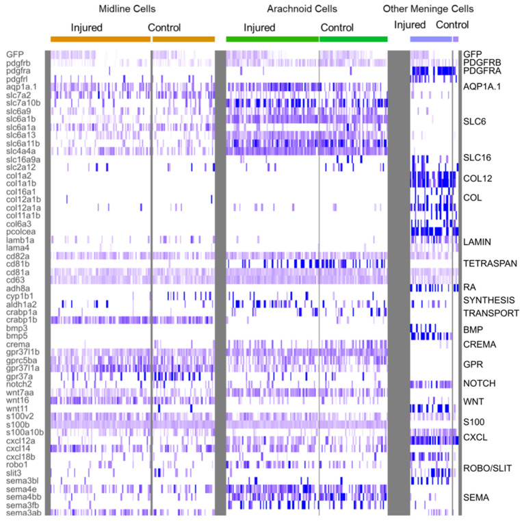 Heatmap of characteristic gene expression levels in MID, ARA and OMN cells from control and injured datasets. Each column represents a cell. Level of expression is encoded by color gradient. Strong expression is in dark blue and no expression is in white. Gene families are represented to the right of the panel in regards to the corresponding DEGs.
