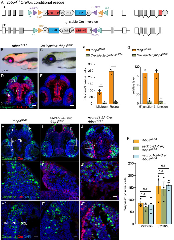 (A) Diagram of expected Cre mediated inversion of rbbp4off to on orientation. (B) Gross morphological phenotype of microcephaly and microphthalmia in 5 dpf transheterozygous rbbp4off/Δlarva. (C) Cre injected 5 dpf transheterozygous rbbp4off/Δ4larva shows rescue of gross phenotype and loss of mRFP expression. (D) Activated caspase-3a labeling throughout midbrain and retina section from 2 dpf transheterozygous rbbp4off/Δ4embryo. (E) Absence of activated caspase-3a labeling in midbrain and retina of 2 dpf transheterozygous rbbp4off/Δ4embryo after Cre injection. (F) Quantification of caspase-3a labeling in control rbbp4off/Δ4(n=3) and Cre injected rbbp4off/Δ4 (n=3) midbrain (** p<0.01) and retina (**** p<0.0001). (G) Genomic DNA qPCR quantification of rbbp4off original orientation 5’ and 3 junctions in control rbbp4off/Δ4 (n=3) and Cre injected rbbp4off/Δ4 (n=3). Cre injection reduced the level of rbbp4off original orientation 5’ (>93%) and 3’ junctions (>93%). (H – J”) Activated caspase-3A and Cre labeling in sectioned head tissue from 2 dpf rbbp4off/Δ4 (H-H"), ascl1b-2A-Cre; rbbp4off/Δ4 (I-I"), and neurod1-2A-Cre; rbbp4off/Δ4 (J-J") embryos. (K) Quantification of caspase-3a labeling in rbbp4off/Δ4(n=3), ascl1b-2A-Cre; rbbp4off/Δ4 (n=3) and neurod1-2A-Cre; rbbp4off/Δ4 (n=3).rbbp4off/Δ4vs. ascl1b-2A-Cre; rbbp4off/Δ4 midbrain (n.s. p=0.3248) and retina (n.s. p=0.8153), and neurod1-2A-Cre; rbbp4off/Δ4 midbrain (n.s. p=0.7794) and retina (n.s. p=0.9365). OT, optic tectum; R, retina; Th, thalamic region. Error bars represent mean ± s.e.m. with two-tailed t-test. Scale bars: 200 μm (B, C), 50 μm (D, E, H – J). 10 μm (H’ – J”).