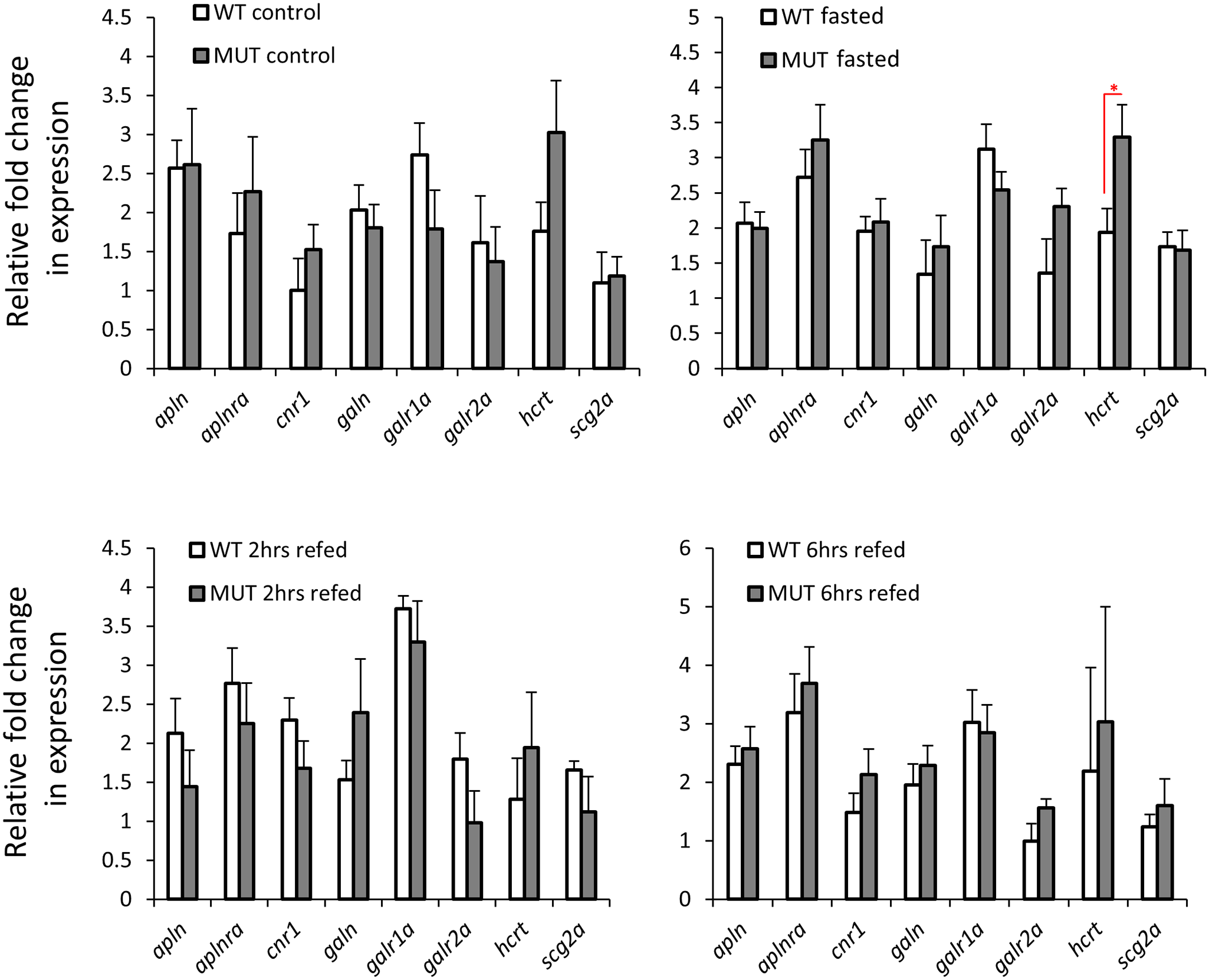 Fig. 2 Fig 2. Expression differences of orexigenic genes in the gut of wild-type versus lepr mutant zebrafish in each feeding group. Means and standard errors of fold changes in expression of five biological replicates are shown for each experimental group. Significant differences between the lepr mutant and wild-type are delineated by asterisks (* P < 0.05).