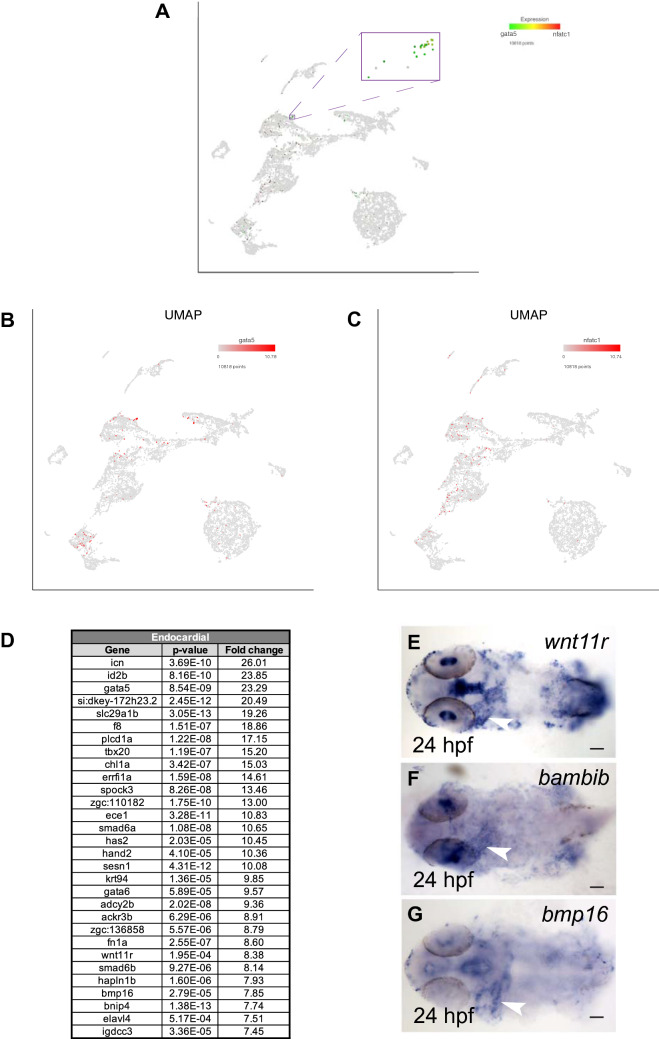Endocardial subcluster. (A) Endocardial cells were identified based on the expression of markers genes gata5 and nfatc1 (log2 > 0). (B,C) UMAP feature plots showing expression of gata5 and nfatc1. (D) List of top 30 genes differentially expressed in the endocardial subcluster. (E–G) In situ hybridization analysis at 24 hpf for selected endocardial enriched genes wnt11r, bambib and bmp16. Note the expression of wnt11r, bambib and bmp16 within the heart tube (arrowhead). Ventral view of deyolked and flat-mounted embryos, anterior is to the left. Scale bars: 100 μm.