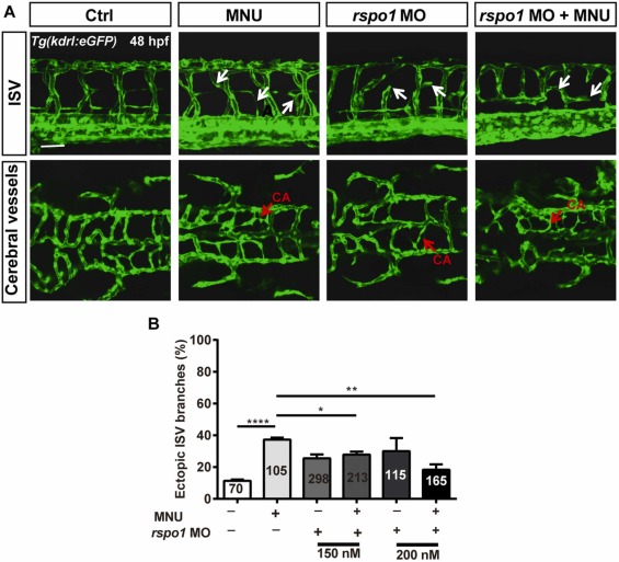 Fig. 4. Rspo1 is required for MNU-induced abnormal angiogenesis. A. Representative images of ISV and hindbrain vessels from control group, MNU-treated group, rspo1 MO-treated group and MNU-treated rspo1 MO group at 48 hpf. White arrows point to ectopic ISV branches. To better observe the phenotype, the concentration of rspo1 MO used was 150 μM for imaging analysis. Red arrows indicate the central artery (CA). Scale bar, 50 µm. B. Quantitative analysis of ectopic intersegmental vessel (ISV) branches in control group, MNU-treated group, rspo1 MO-injected group and rspo1 MO plus MNU-treated group at 48 hpf. Data were obtained from three independent experiments and are expressed as the mean ± SEM. * ** * P < 0.0001, * * P < 0.01, * P < 0.05.