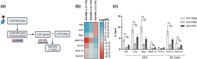 Epigenetic signatures associate with transcriptomic changes in Mtm1 KO mice. a Workflow analysis to identify the correlation between differentially methylated (DM) CpGs identified by RRBS with total differentially expressed genes (DEGs) identified by RNAseq in Mtm1 KO mouse muscle. Of the 2434 DM CpGs, 1638 mapped to various features of proximal genes, encompassing 1447 known gene targets. Within these 1447 genes, a total of 398 had significantly altered expression. b Heat map showing Log2FC of target genes selected for ChIP-qPCR experiment. All genes were DEG in KO + PBS vs WT + PBS mice (FDR **padj < 0.01) and their expression was modulated by VPA treatment. Blue indicates increased expression; red indicates decreased expression between comparisons. d ChIP-qPCR data on selected DEGs or genes with DM CpGs calculated as % input of DNA. WT mice exhibit widespread increases in H3k27ac enrichment compared to KO + PBS that is modulated by VPA. n = 6 biological replicate per group with n = 3 technical replicates per qPCR experiment. Values are expressed as Mean ± SEM. Analyses performed using one-way ANOVA at *p < 0.05