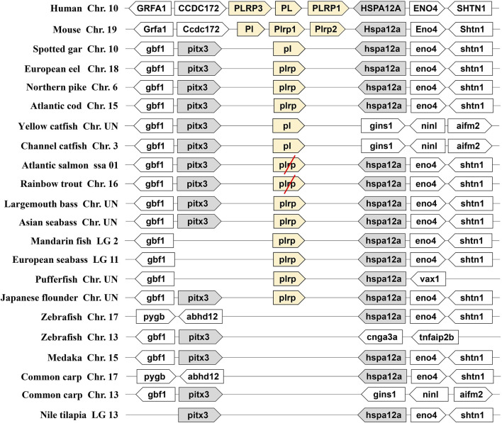 Synteny of pancreatic lipase genes (light yellow) in mammals and fishes. The conserved neighborhood genes (