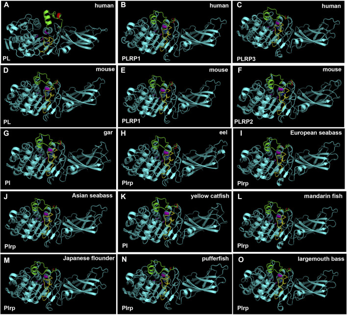 3D structures of pancreatic lipase in human, mouse, and partial fish species. The lid domain and β-9 loop of pancreatic lipase were marked with green and yellow, respectively. The regions of Ile and Leu (or replaced by other amino acids) in the lid domain and β-9 loop were marked with red and blue, respectively. Active site triad residues Ser, Asp, and His were marked with pink.