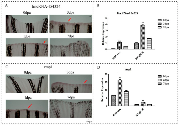 The temporal and spatial expression of lincRNA-154324 and vmp1 in caudal fin regeneration. (A) 0 dpa–7 dpa: lincRNA-154324 spatial expression in zebrafish caudal fin for different processes of regeneration, as shown using WISH. Red arrow: pointing to the positive site. Scale bars: 100 μm. (B) The relative expression of lincRNA-154324 in caudal fin regeneration, as shown using RT-qPCR and RNA-seq. Data (mean ± SEM) are representative results derived from three independent experiments. (**) p< 0.01, when comparing to 0 dpa. (C) 0 dpa–7 dpa: vmp1 spatial expression in zebrafish caudal fin regeneration, as shown using WISH. Red arrow: pointing to the positive site. Scale bars: 100 μm. (D) The relative expression of vmp1 in caudal fin regeneration, as shown using RT-qPCR and RNA-seq. Data (mean ± SEM) are representative results derived from three independent experiments. (**) p < 0.01, when comparing to 0 dpa.