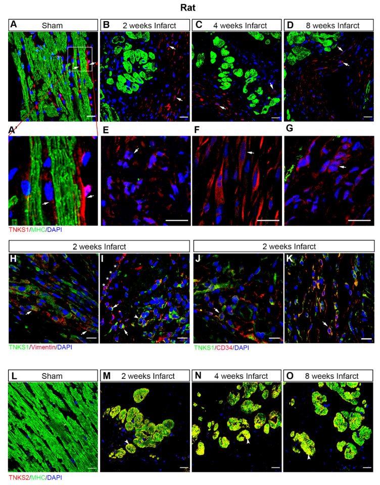 Ischemic injury stimulates TNKS1 in non-cardiomyocytes and TNKS2 in cardiomyocytes in the infarct area in rat hearts. (A–D) Representative immunohistochemical staining of TNKS1 (in red) and MHC (in green) in ventricular sections from sham-operated and MI rat hearts at 2, 4, and 8 weeks post-MI. The TNKS1-positive signal is visualized in the vasculature (arrow) in sham-operated hearts (A,A’) and in non-cardiomyocytes (examples indicated by arrows) in the infarct area at the examined time points (B–D). (A’) Inset: magnified image of TNKS1-positive cells within the vasculature. (E–G) Representative images of immunohistochemical staining showing the TNKS1-positive signal in granulocytes-like cells (E), fibroblasts (F), and endothelium-like cells (G) indicated by the arrow in the infarct area. (H,I) Representative immunohistochemical staining of TNKS1 (in green) and vimentin (in red) showing accumulation of TNKS1 in vimentin-positive fibroblasts (arrow in H), EMT cells (arrow in I), and vascular endothelial cells (arrowhead in I) in the infarct area at 2 weeks post-MI. Stars (* in I) indicate the epicardium. (J,K) Representative immunohistochemical staining of TNKS1 (in green) and CD34 (in red) showing accumulation of TNKS1 in CD34-positive (arrow) vascular endothelial cells (J) and circulating cells (K) in the infarct area at 2 weeks post-MI. (L–O) Representative immunohistochemical staining of TNKS2 (in red) and MHC (in green) in ventricular sections from sham-operated and infarcted rat hearts at 2, 4, and 8 weeks post-MI. The co-localization of TNKS2 and MHC is visualized in cardiomyocytes (arrowhead) in the infarct area at the examined time points. Scale bars: 20 μm.
