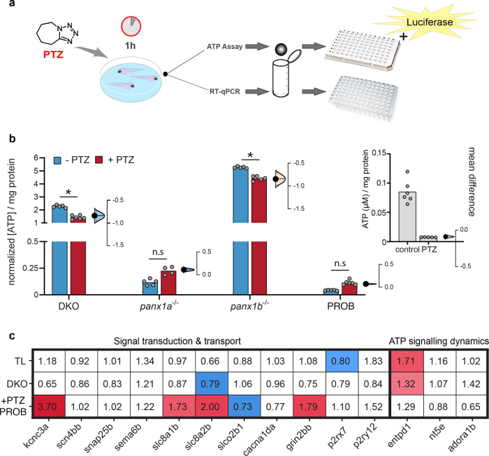 a Gene ontology enrichment of biological processes for differentially regulated genes from RNA-seq data of DKO, panx1a−/−, and panx1b−/− found using the FishEnrichR database. Biological processes were grouped into five categories; transport (GO:0006810), signal transduction (GO:0007165), metabolism (GO:0008152), cellular respiration (GO:0045333), and cell death (GO:0008219). Data is presented as -log P value based on Fisher’s exact test. The dot size represents the combined score for genes associated with that pathway. Dotted gray lines indicate P = 0.05. b Candidate genes were selected, and RNA-seq data was mined for differential regulation in panx1 fish lines. Clustergrams compare panx1 knockout larvae for correlation amongst chosen genes for (1) transport, (2) extracellular ATP (release & degradation), (3) metabolism (respirasome & oxidative phosphorylation) and (4) solute carriers. The scale bar shows standardized correlation values (SCV) calculated by the Matlab Clustergram function. Range: red is positive, and blue is negative. Hierarchical cluster branches are shown above each clustergram and labeled below. c Expression (logpadj) of genes part of the ATP release (top) and solute carrier (bottom) clustergrams for panx1a−/− (blue) and panx1b−/− (top). Filled bars indicate upregulated genes; empty bars are downregulated. P = 0.05 indicated with dotted line.