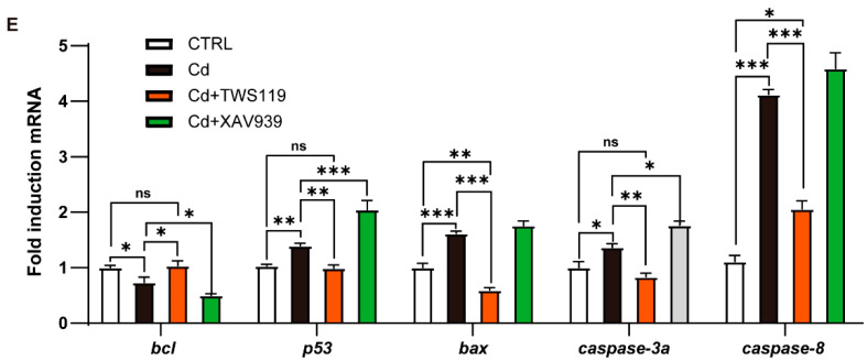 Apoptosis and cell cycle arrest in zebrafish larvae caused by Cd2+ are mediated by Wnt signaling pathway. (A,B) Flow cytometry analysis and distribution of cell cycle phase of neurons and neuronal precursor cells. (C,D) Vertical view in the brain of AO-stained zebrafish larvae (6 dpf) and statistics of apoptotic cell numbers. (E) Relative expression analysis of genes related to cell apoptosis. In histograms, values are represented as mean ± SEM, while in boxplots, values are represented as median and mean, and whiskers signify 90% confidence interval. The results of nonparametric test and ANOVA, as well as multiple comparison test are listed in Table S2. “*” indicates significant differences (* p < 0.05, ** p < 0.01, *** p < 0.001).