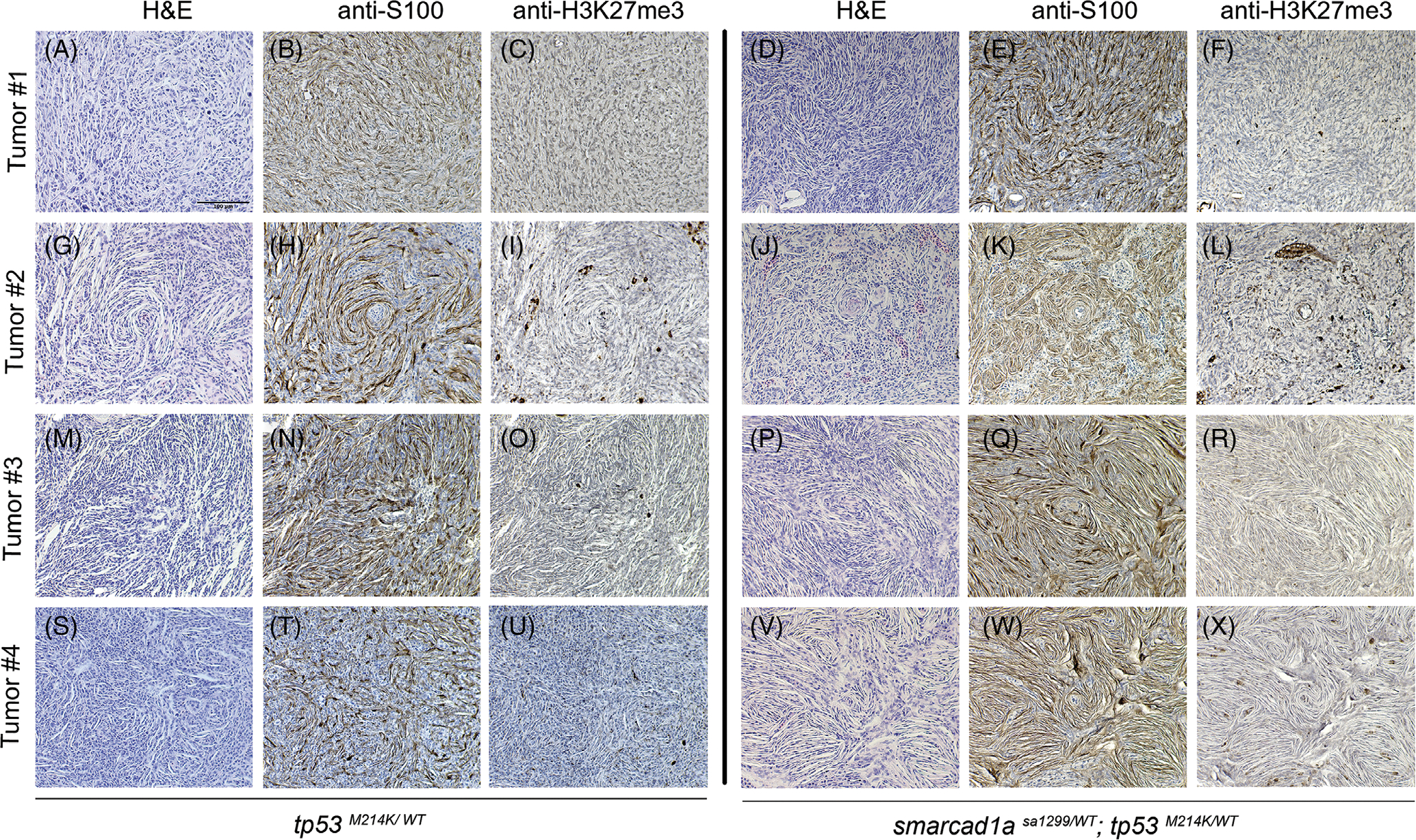 Confirmation of zebrafish MPNSTs with S100 and H3K27me3. Four random tumors from tp53 heterozygotes and double heterozygotes (tp53 and sa1299) were stained with S100 and H3K27me3 antibodies. (A–C, G–I, M–O, S–U): tp53 heterozygotes. (D–F, J–L, P–R, V–X): double heterozygotes. HE (hematoxylin and eosin) staining: A, D, G, J, M, P, S, V. IHC with S100 antibody: B, E, H, K, N, Q, T, W. IHC with H3K27me antibody staining: C, F, I, L, O, R, U, X. Some stained cells are non-Schwann cells in these sections, but they serve as a positive control for the antibody specificity. All the images were taken at the same magnification. Scale bar = 100 μm in panel A