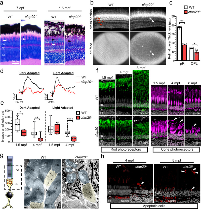 a The larval, 7 days post-fertilisation, cfap20−/− homozygote retina is indistinguishable from wildtype (WT) animals (green bracket = rod and blue/red/green cone OS and RPE, white arrowhead = UV cone OS). By 1.5 months post-fertilisation (mpf) the homozygote retina is degenerate with loss of organised cone subtype layers (green bracket = rod OS and RPE, white arrowhead = UV cone OS, black arrowhead = blue/red/green cone OS) and poorly defined OPL (asterisk). b, c By 4 mpf, the cone mosaic is lost in homozygotes and hyperreflective blebs (arrows) are observed in the outer retina (Optical Coherent Tomography B-scans (cross section) and en face projections). The photoreceptor and OPLs are thinner in homozygotes (n = 5; error bars = SEM; two-tailed unpaired Mann-Whitney, pR P = 0.0079, OPL P = 0.0238). Representative full-field electroretinogram traces from 4 mpf dark (DA) or light adapted (LA) animals presented in d. e At both ages, the DA b-wave is reduced in homozygotes (two-tailed unpaired T-tests; 1.5 mpf: n = 8 WT, 4 cfap20−/−; P = 0.0382; 4 mpf n = 19 WT, 7 cfap20−/−; P = 0.0017) whereas the LA b-wave is reduced only at 4 mpf (two-tailed unpaired T-tests; 1.5 mpf: n = 14 WT, 4 cfap20−/−; P = 0.6010; 4 mpf: n = 20 WT, 7 cfap20−/−; P = 5.60 * 10−5). Box plots: minima, 25th percentile, median, 75th percentile, maxima. f Rod and cone layers are shorter and became disorganised over time, with cone OSs detachment at 4 and 8 mpf (arrowheads). g False-coloured TEM micrographs reveal reduced density and OS dysmorphia of homozygotes at 8 mpf. Detached OSs (arrows) are engulfed by RPE. h Apoptotic cells (arrowheads) are observed in the outer retina of homozygotes but never WTs controls. IPL inner plexiform layer, INL inner nuclear layer, OPL outer plexiform layer, ONL outer nuclear layer, pR photoreceptor layer, IS inner segment, OS outer segment, RPE retinal pigment epithelium. See also Supplementary Figs. 9 and 10. Source data are provided as a Source Data file.