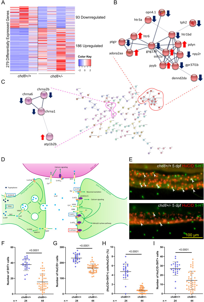 (A) Heatmap shows gene expression for the 279 differentially expressed genes: 93 down-regulated genes and 186 up-regulated genes in chd8 sa19827/+. Values have been centered and scaled for each row. Each row represents a single gene. The full list of genes, P-values, and associated annotations is provided in Supplemental Data 1. (B, C) Protein–protein interaction network of the differentially expressed genes in chd8 sa19827/+. Nodes with no interactions with other proteins of the protein–protein interaction network are not shown. Line thickness indicates the strength of data support. The full network is shown in Fig S2. (B) Cluster of 14 proteins including four proteins of the serotonin signaling pathway: htr1bd, htr3a, htr6, and tph2. (C) Cluster of four proteins including three proteins involved in the acetylcholine signaling pathway: chrna1, chrna2b, and chrna6. (D) Serotonergic synapse adapted from KEGG pathways. Genes boxed in blue denote down-regulated genes, and genes boxed in red denote up-regulated genes. (E) Representative lateral images of the intestine of chd8+/+ and chd8 sa19827/+ zebrafish larvae at 5 days post-fertilization stained with anti-HuC/D and anti-5-HT monoclonal antibodies to visualize the enteric post-mitotic neurons and the enteric serotonergic cells, respectively. White arrowheads show serotonergic neurons (HuC/D- and 5-HT–positive cells). (F) Dot plot of the number of 5-HT–positive cells for each condition tested. A t test was conducted between pairs of conditions. (G) Dot plot of the number of HuC/D-positive cells for each condition tested. A Mann–Whitney test was conducted between pairs of conditions. (H) Dot plot showing the percentage of serotonergic neurons, for each condition tested. A Mann–Whitney test was conducted between pairs of conditions. (I) Dot plot of the number of HuC/D-negative/5-HT–positive cells for each condition tested. A Mann–Whitney test was conducted between pairs of conditions. n, number of larvae.
