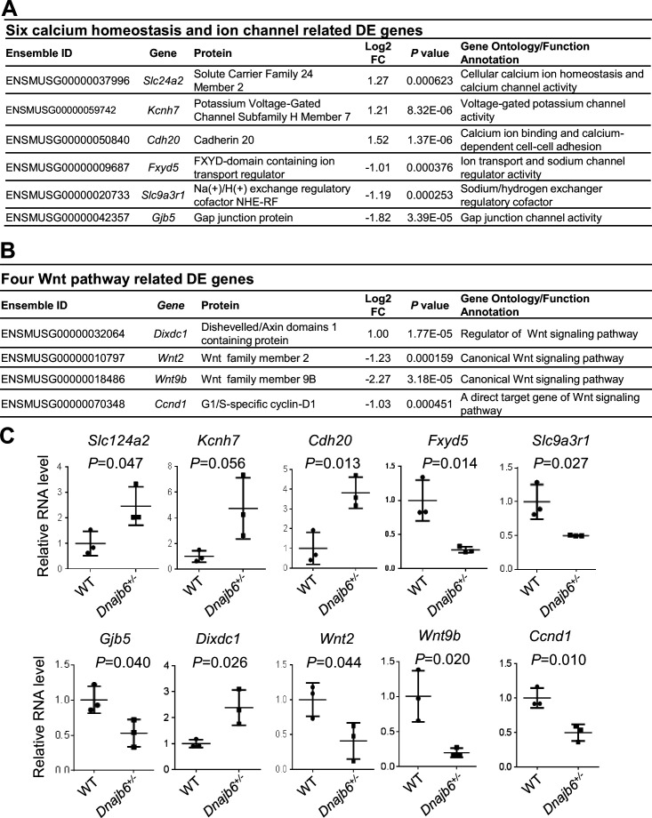 (A) Expression of six calcium homeostasis and ion channel related genes were altered in the Dnajb6+/- mice right atrium. (B) Expression of four Wnt pathway related genes were altered in the Dnajb6+/- mice right atrium. (C) Quantitative polymerase chain reaction (qPCR) validation of DE genes listed in A and B, normalized to Gapdh; RNA was extracted from an individual moue right atrium, which was considered a single biological replicate. Samples were collected in triplicate. N=3 mice per group, unpaired student’s t-test.
