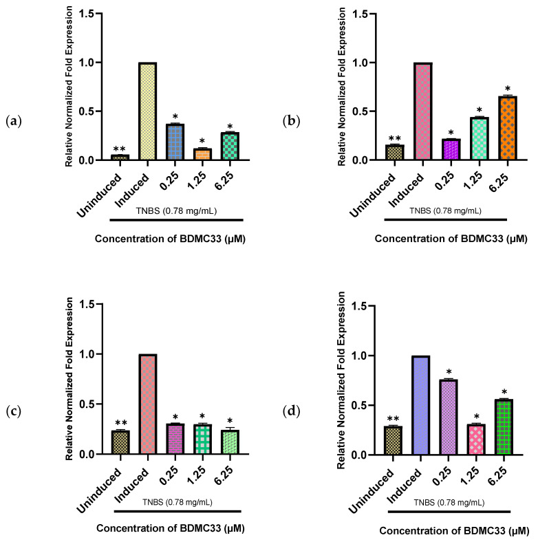 Relative normalized fold expression in (a) BMP2a, (b) BMP7b, (c) BMP4, and (d) BMP6 genes induced with 0.78 mg/mL of TNBS and treated with BDMC33 at three different concentrations (0.25, 1.25, and 6.25 μM). Thirty 12-day-old larvae were pooled from each of the uninduced, TNBS-induced, and TNBS-induced with treatment (BDMC33) groups for total RNA extraction. All genes were normalized against two reference genes: GAPDH and β actin. Data are expressed as the mean ± S.E.M. of three replicates. Values of * p < 0.05 and ** p < 0.01 were considered significantly different from the induced group.