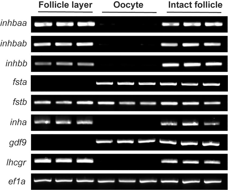 The activin β subunits (inhbaa, inhbab and inhbb) and inhibin α (inha) were exclusively expressed in the follicle layer whereas follistatin a (fsta) was exclusively expressed in the oocyte. Follistatin b (fstb) was expressed in both follicle layer and oocyte. The housekeeping gene (ef1a) was expressed in both cell types, while gdf9 and lhcgr were exclusively expressed in oocyte and follicle layer, respectively, indicating clean separation of the two compartments.