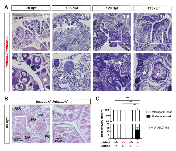 (A) Ovary of some mutant individuals (~10%) at 70–135 dpf. The ovary contained PG follicles only at 70 dpf, and much of the inter-follicular space was filled with abundant stromal cells. At later development stages (105, 120 and 135 dpf), PV follicles could occasionally be observed; however, there were no vitellogenic follicles and the ovaries were mostly occupied by over-proliferated stromal cells. The boxed areas are shown at higher magnification below. The numbers shown in the photos indicate the total number of fish examined (lower) and the fish exhibiting similar phenotype to that shown (upper). (B) Ovary in the control fish (inhbaa+/-;inhbab+/-) at 85 dpf. Vitellogenic follicles developed normally in the control. (C) Statistical analysis of ovarian types from 105 to 135 dpf (***p < 0.001; n = 3 batches). PG, primary growth; PV, previtellogenic; MV, mid-vitellogenic; FG, full-grown; asterisk, infiltrating stromal tissue.