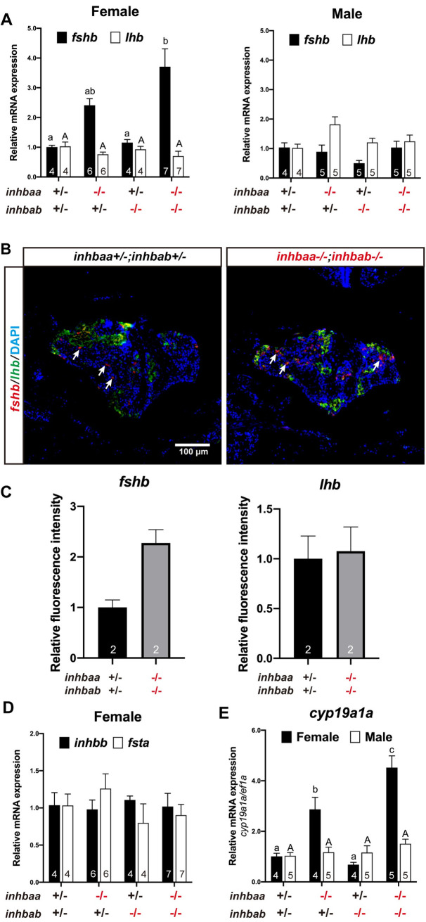 (A) Expression of fshb and lhb in the pituitary of activin βA mutants at 90 dpf. (B) Fluorescence in situ hybridization for fshb (arrows) and lhb in female pituitaries of the control (inhbaa+/-;inhbab+/-) and double mutant (inhbaa-/-;inhbab-/-) at 90 dpf. (C) Quantification of the in situ hybridization signals in the double mutant (n = 2). (D) Expression of inhbb and fsta in the pituitary of activin βA female mutants at 90 dpf. (E) Expression of aromatase (cyp19a1a) in the ovary and testis of the βA mutants at 90 dpf. Sample size is indicated in each column, and different letters in each dataset indicate statistical significance (p < 0.05).