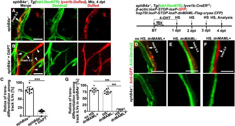 Figure 5. EphB4a represses track iLV transdifferentiation through suppression of Notch (A–C) The derepressed transdifferentiation of track iLV (Dendra2+DsRed+) in the ephB4a mutant (A, arrow) was rescued by treatment with DAPT, which returned to Dendra2−DsRed+ (B, arrowheads). The statistics show the ratios of transdifferentiation among track iLVs in the ephB4a mutant with or without DAPT treatment (C) (n = 10 larvae; two-tailed unpaired t test; ∗∗∗, p < 0.0001). (D–G) The derepressed transdifferentiation of track iLV (Dendra2+GFP+) in the ephB4a mutant without heat shock (D, arrow) or without dnMAML-Flag (E, arrow) was rescued by the heat-shock-induced, LEC-specific overexpression of dnMAML-Flag, which exhibited Dendra2−GFP+ at 4 dpt (F, arrowhead). The statistics show the ratios of transdifferentiation among track iLVs in the ephB4a mutant groups (G) (n = 10 larvae; two-tailed unpaired t test; ∗∗∗, p < 0.0001). Scale bar, 20 μm. Data are represented as mean ± SD. HS, heat shock. See also Figures S6 and S7.