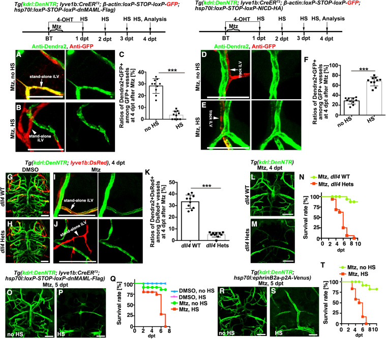 Figure 6. The stand-alone iLV-to-BV transdifferentiation is dependent on Notch and critical for postinjury survival (A–C) Transdifferentiation of the stand-alone iLVs (A, arrow) was inhibited by the LEC-specific overexpression of dnMAML-Flag (B, arrowhead). The statistics show the ratios of Dendra2+GFP+ vessels among all the GFP+ vessels (C) (n = 10 larvae; two-tailed unpaired t test; ∗∗∗, p < 0.0001). (D–F) The track iLVs (D, arrows) were induced to undergo LV-to-BV transdifferentiation by the LEC-specific overexpression of NICD-HA (E, arrowhead). The statistics show the ratios of Dendra2+GFP+ vessels among all the GFP+ vessels (F) (n = 10 larvae; two-tailed unpaired t test; ∗∗∗, p < 0.0001). (G–K) In contrast to the wild-type (G), the uninjured dll4 heterozygotes (H) were physiologically normal including brain BVs and BLECs. But after Mtz treatment, the stand-alone iLV-to-BV transdifferentiation (I, arrow) failed to occur in the dll4 heterozygotes (J, arrowhead). The statistics show ratios of Dendra2+GFP+ vessels among all the GFP+ vessels (K) (n = 10 larvae; two-tailed unpaired t test; ∗∗∗, p < 0.0001). (L–T) The dll4 heterozygotic mutation (L–N), the LEC-specific overexpression of dnMAML-Flag (O–Q), and general overexpression of EphrinB2a (R–T), led to defects in the formation of early-regenerated BVs and became lethal. The statistics show the survival rates (N, n = 32; Q, n = 40; T, n = 36). Note that the majority of the larvae with defective formation of early-regenerated BVs died before 6 dpt, while all of them died by 7 dpt. Scale bar, 50 μm. Data are represented as mean ± SD. Hets, heterozygotes; HS, heat shock. See also Figures S6 and S7.
