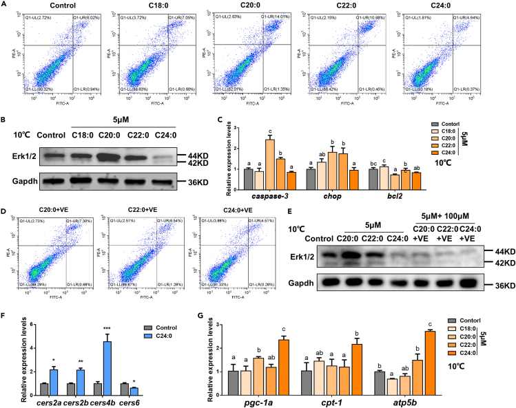 (G) The expression levels of β-oxidation-related genes in ZFL cells under cold stress, after incubation with different SFAs. Data were given as means ± SD of three biological replicates. The statistical analyses were conducted by t test or one-way ANOVA with Tukey's post hoc test. The different letters above the bars indicated significant differences (p < 0.05). The asterisks labeled above the error bars indicated significant differences (∗p < 0.05, ∗∗p < 0.01, ∗∗∗p < 0.001). Erk1/2, extracellular signal-regulated kinases 1/2; Gapdh, glyceraldehyde-3-phosphate dehydrogenase; chop, DNA damage inducible transcript 3; bcl2, BCL2 apoptosis regulator a; VE, vitamin E; cers, ceramide synthase; pgc-1a, peroxisome proliferator-activated receptor-γ coactivator-1a; cpt-1a, carnitine palmitoyl transferase 1a; atp5b, ATP synthase F1 subunit beta.