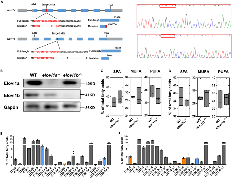 (E and F) Fatty acid compositions in livers of 2-month-old elovl1a–/– (E) and elovl1b–/– (F) zebrafish. The blue and orange colors in (E) and (F), respectively, meant significant decrease and increase in parameters of elovl1a–/–/elovl1b–/– zebrafish, compared with WT zebrafish (p < 0.05). Data were given as means ± SD of three or four biological replicates. The statistical analyses were conducted by t test. WT, wild-type zebrafish; elovl1, fatty acyl elongase 1; elovl1a–/–, elovl1a knockout zebrafish; elovl1b–/–, elovl1b knockout zebrafish; SFA, saturated fatty acid; MUFA, monounsaturated fatty acid; PUFA, polyunsaturated fatty acid; Gapdh, glyceraldehyde-3-phosphate dehydrogenase.