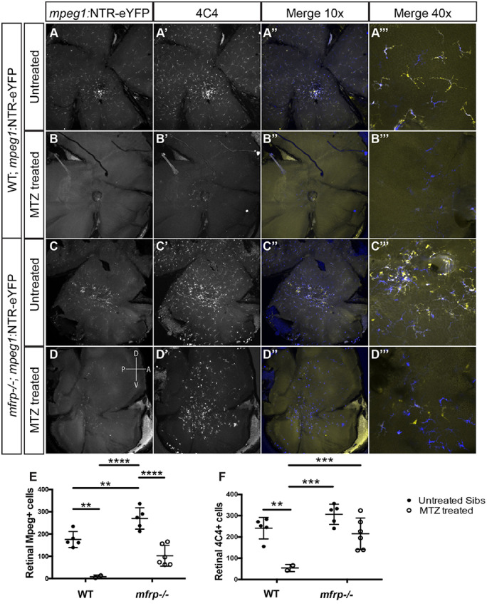 Efficient macrophage ablation in the mfrp retina. (A–D) mpeg1:NTR-eYFP expression in WT and mfrp–/– retina flat-mount preparations with and without MTZ treatment. (A'-D') Immune staining for 4C4 antibody marking macrophages. (A''–D'') Merged and colorized images of A–D', with blue representing 4C4 and yellow representing YFP. (A'''–D''') Higher magnification images of (A'') to (D''). (E, F) Cell counts of mpeg1:NTR-eYFP+ cells (E) or 4C4+ cells (F) in WT and mfrp–/– retina flat-mount preparations with and without MTZ treatment. Two-way ANOVA was used for statistical analysis. Sidak's multiple comparisons were used for post hoc analysis. *P < 0.05, **P < 0.01, ***P < 0.001, ****P < 0.0001. For WT untreated, n = 5; for WT MTZ treated, n = 2; for mfrp–/– untreated, n = 5; for mfrp–/– MTZ treated, n = 6.