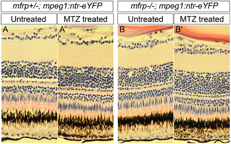 Macrophage ablation did not significantly alter retina morphology. (A–B') Hematoxylin and eosin–stained paraffin histology of the central retina in mfrp+/–; mpeg1:NTR-eYFP+ (A, A') and mfrp–/–; mpeg1:NTR-eYFP+ (B, B') with and without MTZ treatment.