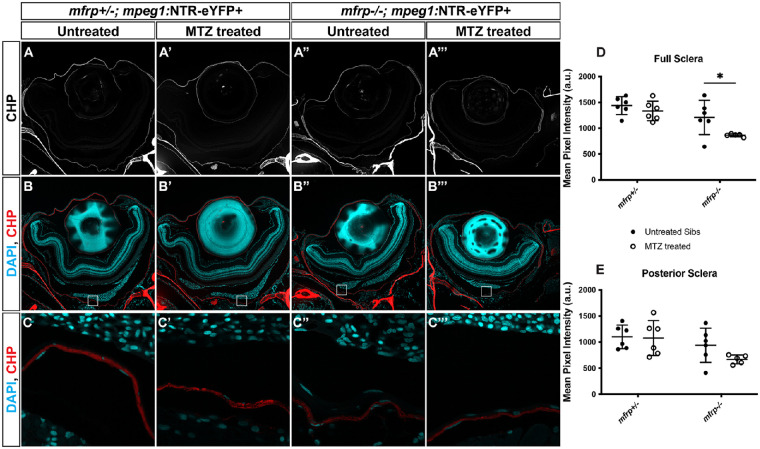 Macrophage ablation alters scleral accessibility to a collagen hybridizing peptide. (A–C) Representative images of central retina sections from mfrp+/–; mpeg1:NTR-eYFP+ and mfrp–/–; mpeg1:NTR-eYFP+ MTZ treated and untreated fish. (A–A''') Grayscale CHP images. (B–B''') Colorized and merged images with DAPI in cyan and CHP in red. (C–C''') High-magnification images of regions of interest in the posterior sclera as indicated by white outlines in (B) to (B'''). (D, E) Quantification of the mean pixel intensity of the CHP staining across full sclera (D) and at central posterior sclera (E). For whole sclera (D), both genotype (P = 0.001) and MTZ treatment (P = 0.022) had a significant effects. In the posterior sclera (E) only genotype (P = 0.0204) had a significant effect. Two-way ANOVA was used for statistical analysis. P values are shown from Sidak's multiple comparisons for post hoc analysis. Error bars represent standard deviations. *P < 0.05. For mfrp+/– untreated, n = 6; for mfrp+/– MTZ treated, n = 6; for mfrp–/– untreated, n = 6; for mfrp–/– MTZ treated, n = 5.
