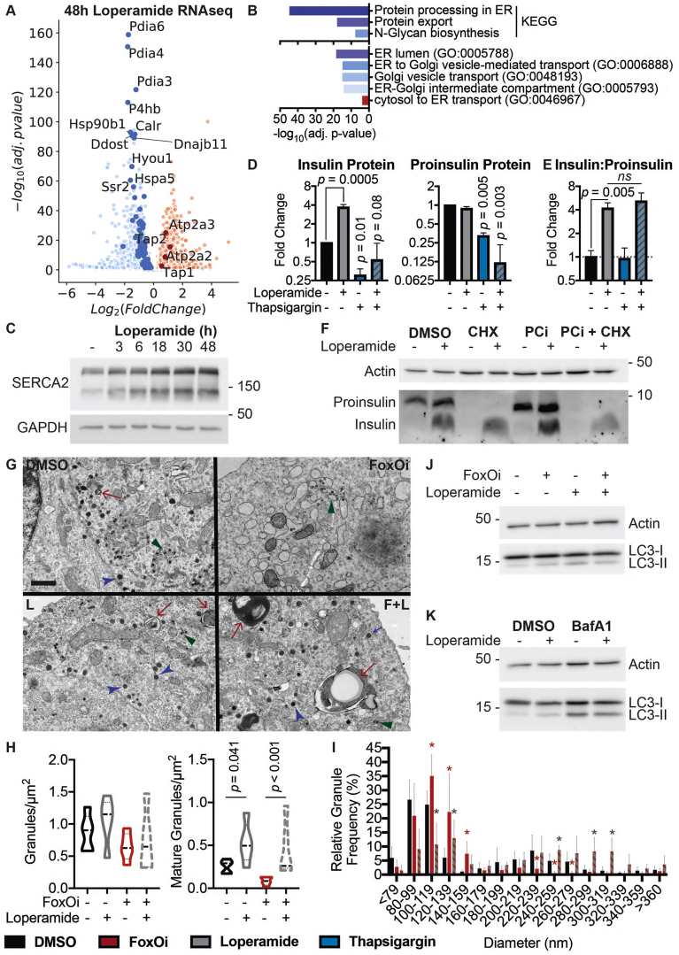 Fig. 4 Loperamide alters ER proteome, rescuing FoxOi-induced arrest in insulin granule maturation and promotes autophagy.A. Volcano plot of gene expression changes upon 48h loperamide treatment, as measured by RNAseq. B. Overview of top enrichment terms for genes both significantly altered by loperamide relative to control and significantly rescued when co-treated with FoxOi relative to FoxOi. Volcano plot highlights the top KEGG term (protein processing in ER) in blue and GO:0046967 in red. C. Western blot showing increase in SERCA2 protein upon loperamide treatment in Min6 cells. D. Total intracellular insulin and proinsulin protein levels in Min6 cells treated with loperamide and 100 nM thapsigargin for 24h, as quantified by ELISA. E. Ratio of mature insulin to proinsulin protein. F. Western blot of proinsulin and insulin protein levels following 48h treatment of Min6 cells with loperamide +/− 200 μg/mL cycloheximide (CHX) or 10 μM prohormone convertase inhibitor (PCi) for the final 24h. G. Representative electron microscopy images of Min6 cells treated with FoxOi or loperamide. L = Loperamide; F + L = FoxOi + Loperamide. Green arrows pointing to immature secretory granules. Red arrows highlighting (autophago-)lysosomes. Blue arrows indicate mature insulin secretory granules. Scale bar = 1 μm. H. Quantification of insulin granule density in electron microscopy images. Total number of granules per μm2 (right) and number of mature (>160 μm in diameter) granules per μm2. N = 5 cells per treatment condition. I. Histogram of insulin granule size distribution upon FoxOi/loperamide treatment. DMSO = black; FoxOi = red; FoxOi + Loperamide = red/gray stripes. N = 5 cells per treatment condition. J. Levels of LC3B in Min6 cells treated with FoxOi and loperamide for 48h. K. Levels of LC3B in Min6 cells treated with loperamide for 48h +/− 200 nM bafilomycin A1 for the final 2h.