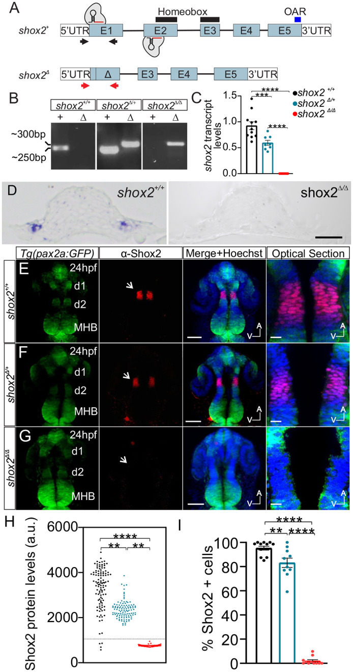 Fig. 1. Generating shox2 mutant zebrafish. (A) Genomic representation of wild-type shox2 (shox2+) gene containing five exons (E1-5), 5′ and 3′ untranslated regions (UTRs). Black lines above exons 2 and 3 demarcate the coding region for the homeobox domain. The blue line above exon 5 marks the otp, aristaless, and rax (OAR) domain. Black arrows represent the approximate primer binding sites utilized for PCR genotyping of shox2+. The shox2 null allele was generated using two CRISPR/Cas9 sgRNAs complexes that bind and cleave in exons 1 and 2. Repair and joining of the two cut sites deleted genomic DNA containing parts of exon1 and 2 to create the shox2 null allele (shox2Δ). Red arrows denote the approximate binding site of primer pairs for PCR genotyping of shox2Δ. (B) shox2Δ (Δ) and shox2+ (+) PCR products using DNA obtained from shox2+/+,shox2Δ/+, and shox2Δ/Δ embryos. (C) Quantification of shox2 transcript levels by RT-qPCR. shox2+/+ (1.00±.08; n=11), shox2Δ/+ (0.59±0.05; n=8) and shox2Δ/Δ (0.0003±0.0001; n=11) embryos. Each dot represents data from an individual embryo at 24 hpf. (D) Section of the otic placode in 18 somite stage embryos after in situ hybridization with shox2 probe in shox2+/+ and shox2Δ/Δ embryos. Whole-mount immunofluorescence labeling of Shox2 on 24 hpf embryos from (E) shox2+/+, (F) shox2Δ/+ and (G) shox2Δ/Δ larva in the Tg(pax2a: GFP) reporter background. Fluorescent images from Tg (pax2a: GFP) (green) reporter, Shox2 (red) immunostaining, merged image with Hoechst (blue). Magnified images show optical sections of merged images. Arrows point to the diencephalic region with Shox2 expression. Optical sections of the region flanked by d1 and d2 containing nuclear Shox2 labeling were used for fluorescence quantification. (H) Shox2 immunofluorescence signal from individual cells taken from shox2+/+ (3544±44.8 a.u., n=965 cells, 12 embryos), shox2Δ/a (2279±32.1 a.u., n= 687 cells, ten embryos) and shox2Δ/Δ (744.9±4.9 a.u., n=885 cells, 11 embryos). A threshold of two standard deviation above average background signal (1053 a.u.) was set (dotted line). Cells above the threshold were considered Shox2 positive and used for comparison. (I) Percent of Shox2 expressing cells in cohort in shox2+/+ (95.3±1.6%), shox2Δ/a (83.2±3.9%) and shox2Δ/Δ (1.95±1.0%) larvae. Cell and embryo numbers as listed above. One-way ANOVA and Sidak multiple comparisons tests were used for statistical analysis. Values reported as mean±s.e.m. **P≤0.01, ***P≤ 0.001; ****P≤ 0.0001. d1-d2; diencephalic domain 1 and 2; MBH, mid hindbrain boundary; a.u., arbitrary units, s.e.m. standard error of the mean. Scale bars: 10 µm.