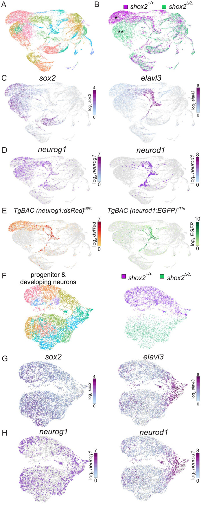 Fig. 6. Identifying cell populations in shox2+/+ and shox2Δ/Δ embryos by single cell RNA-seq. (A) shox2+/+ (n=59 embryos) and shox2Δ/Δ embryos (n=43 embryos) at 16-22 hpf were harvested and tissue around the otic vesicle microdissected. Samples of the same genotype were pooled and subjected to scRNA-seq. Transcriptome of individual cells were aggregated, dimensionality reduction performed followed by unsupervised clustering before visualizing as a UMAP projection. Course-grain visualization of 29,152 cells identified 28 distinct cell types after clustering. (B) Cells from shox2+/+ (magenta) and shox2Δ/Δ (green) were identified using by library barcodes to display different and common cell populations. Major differences between wild-type and mutant cell populations were marked by single or double asterisks respectively. (C) sox2 highlight progenitor cells while elavl3 mark developing neurons. (D) neurog1 and neruod1 identify neuronal progenitors and developing neurons. (E) Cells expressing dsRed and EGFP from transgenes introduced into shox2+/+ embryos. Cell clusters identified from graph-based clustering that overlapped with dsRed and EGFP in shox2+/+ and shox2Δ/Δ were used to identify progenitors and developing neurons. (F) Plot of progenitor and development obtained from identified subset of cell clusters were obtained for further analysis. Progenitor and developing neuron populations from shox2+/+ (magenta) and shox2Δ/Δ (green) cells were identified using library identification barcodes for each genotype. (G) Sub-population of cells express sox2 and elavl3 to mark progenitor and developing neurons, respectively. (H) Sub- population of cells express neurog1 and neruod1 to mark neuronal progenitors and developing neurons, respectively.