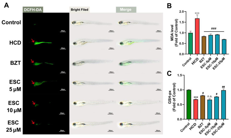Anti-oxidant effect of ESC on an HCD-induced larval zebrafish model. (A) The DCFH-DA stain of larval zebrafish. (B) MDA of larval zebrafish. (