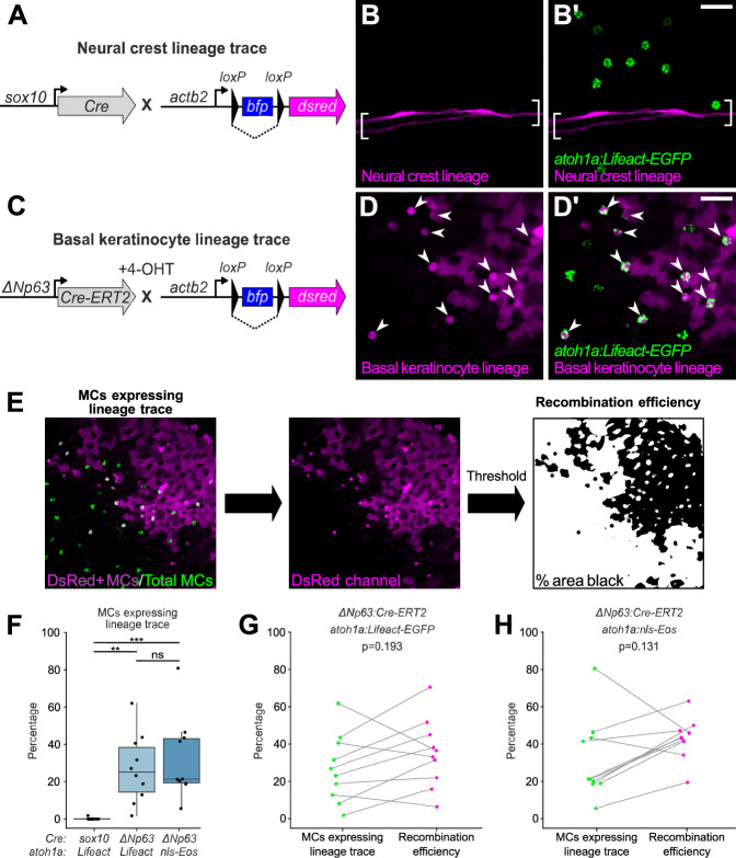 (A) Schematic of Cre-based neural crest lineage tracing strategy. (B) Confocal micrograph of the scale epidermis in an adult expressing neural crest lineage (Tg(sox10:Cre); Tg(actb2:LOXP-BFP-LOXP-DsRed)) and MC (Tg(atoh1a:Lifeact-EGFP)) reporters. Brackets denote Schwann cells associated with a nerve along a scale radius. (C) Schematic of Cre-based basal keratinocyte lineage tracing strategy. (D) Confocal micrograph of the scale epidermis in an adult expressing basal keratinocyte lineage (TgBAC(ΔNp63:Cre-ERT2); Tg(actb2:LOXP-BFP-LOXP-DsRed)) and MC (Tg(atoh1a:Lifeact-EGFP)) reporters, which was treated with 4-hydroxytamoxifen (4-OHT) at 1 day post-fertilization (dpf). Arrowheads indicate MCs labeled by the basal keratinocyte lineage reporter. Note that recombination is not complete, possibly explaining why not all MCs express the lineage reporter. (E) Workflow to calculate percentage of MCs expressing lineage reporter and percentage of total cells expressing lineage reporter. (F) Boxplots of the percentage of MCs expressing the lineage tracing reporters diagrammed in panels A and C. Each dot represents an individual scale. Overall percentage of MCs expressing lineage trace reporters: sox10/Lifeact, 0.3% (1/323 cells; N=6 adults, 27.5–31 mm standard length [SL]); ΔNp63/Lifeact, 29.7% (299/1005 cells; N=6 adults, 21–26 mm SL); ΔNp63/nls-Eos, 32.3% (386/1195 cells; N=4 adults, 20–30 mm SL). A one-way ANOVA (F=12.06; p<0.001) with Tukey’s post-hoc honestly significant difference (HSD) test was used to compare groups. **, p<0.01; ***, p<0.001. (G and H) Paired dot plots of the percentage of MCs expressing the indicated atoh1a reporter and the basal keratinocyte lineage reporter compared to the percentage of all cells in the field of view expressing DsRed. Statistical analyses were performed using the Wilcoxon test. Scale bars: 20 µm.
