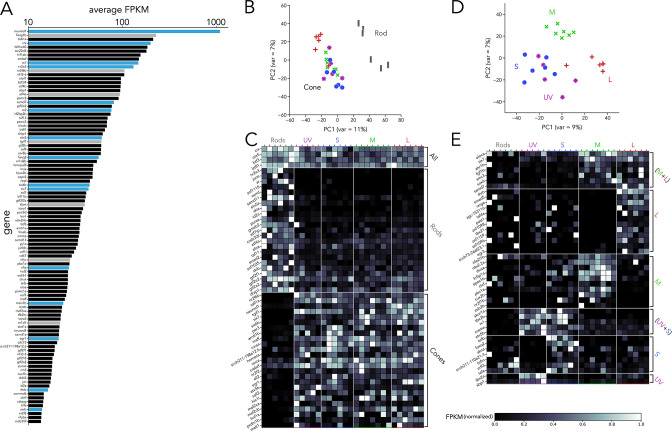 (A) Top 100 transcription factors ranked by average expression across all samples, displayed on a logarithmic scale. Genes highlighted in blue are known to be critical in photoreceptor progenitors or during photoreceptor development. Some limited information about function in photoreceptors exists for genes highlighted in grey. (B) Principal component analysis (PCA) of transcription factor expression shows that differences between rods and cones are the main source of variance. (C) Heatmap showing differential expression of transcription factors between rods and cones and divided into three groups: consistently expressed by all photoreceptors, enriched in rod samples, and enriched in cones samples. Grey values indicate expression level normalized by the maximal value in each row. Rod- and cone-enriched genes have been arranged by degree of enrichment. (D) PCA of cone samples shows that the largest differences in expression separate L cones (PC1) and M cones (PC2), while separation of UV and S cones is more difficult. (E) Heatmap of transcription factors differentially expressed in cone subtypes, divided into six relevant groups. Full list of differentially expressed transcription factors available in Supplementary file 2, Supplementary file 3.