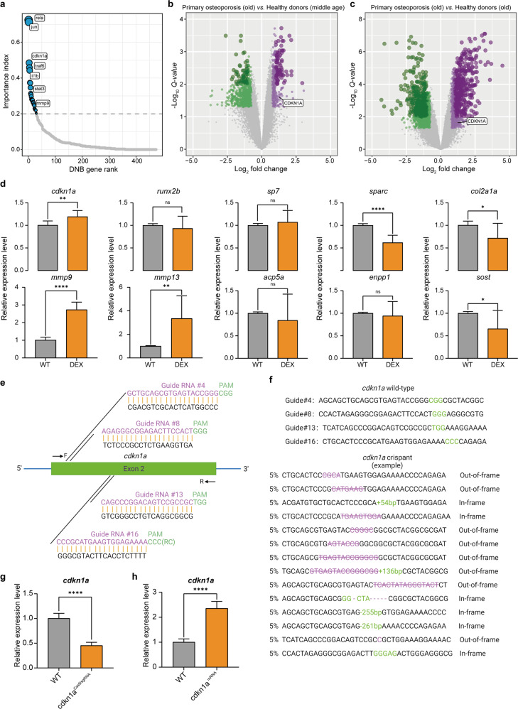 a The diagram illustrates the DNB ranking during the critical transition of osteoporosis based on network degrees and pathway hits. b, c Volcano plot of differentially expressed genes between primary osteoporosis patients and middle-aged/elderly healthy donors. d The relative expression level of representative osteoporosis-associated genes was validated by quantitative real-time polymerase chain reaction (qRT‒PCR) in the wild-type (WT) and DEX-treated zebrafish (n = 20). e Diagram of the cdkn1a-targeting gRNA sequences. CGG, GGG, TGG and CCC (green) are the protospacer adjacent motif (PAM) sequences. Arrows indicate primer positions. f In cdkn1a crispant zebrafish, representative Sanger sequencing results of the PCR amplicons from 14 individual embryos showed different out-of-frame and in-frame indel mutations induced by Cas9/sgRNA in the targeted sites. Substitutions are represented in purple, deletions are indicated by purple strikethroughs, and insertions are highlighted in green. g, h The relative expression levels of cdkn1a were validated by qRT‒PCR in the WT, cdkn1aCas9/sgRNA, and cdkn1amRNA-treated larvae (n = 20). *P < 0.05, **P < 0.01, ****P < 0.0001, Student’s t-test.