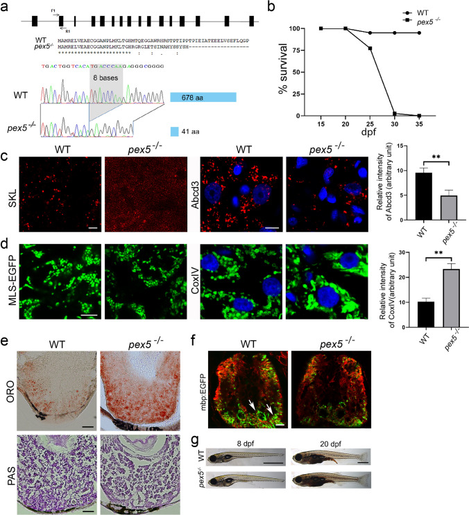 Loss of Pex5 in zebrafish induces liver defects and myelination abnormality due to the decreased peroxisome number. a Schematic view of the genomic structure of pex5 in zebrafish is shown with 16 exons in black rectangles. F1 and R1 indicate the position and direction of the primer sequences that were used for the clustered regularly interspaced palindromic repeat/caspase 9 (CRISPR/Cas9)-mediated gene inactivation. A partial amino-terminal sequence of WT Pex5 is compared to that of Pex5 mutant protein. Note that the 8-base pair deletion shown in the sequencing chromatogram of the pex5 gene is predicted to translate a truncated version of the Pex5 mutant protein comprised only 41 amino acids with a stretch of unrelated carboxy-terminal sequences. b Survival curve for pex5−/− under normal feeding conditions. Heterozygous pex5+/− zebrafish were incrossed, and the percentage of survived larvae per genotype at the indicated developmental times was plotted with assumption of Mendel’s segregation ratios. c Peroxisomes are shown in the liver sections of WT and pex5−/−. The RFP-SKL expression from the Xla.Eef1a1:RFP-SKL transgene was used as a surrogate to detect the subcellular localization of the peroxisomal matrix proteins. The expression levels of endogenous PMP70 proteins detected by immunofluorescence were shown to illustrate an abundance of peroxisome membrane proteins that are independently incorporated in the peroxisome membrane from the matrix-import pathway. Scale bar = 5 μm. Graph shows quantified signal intensity of Abcd3 and presented as the average with error bars indicating standard deviation. Statistical significance was determined using the Student’s t test in Microsoft Excel; * and ** indicate p values < 0.05 and < 0.01, respectively. d Mitochondria are shown in the liver sections of WT and pex5−/−. Expression of mitochondria-targeted enhanced green fluorescent protein (EGFP) (MLS-EGFP) was used to detect the general shape of mitochondria, whereas immunofluorescence of a component of the mitochondrial respiratory chain complex IV (CoxIV) was performed to reveal the differential expression of an endogenous mitochondria-targeted protein. Scale bar = 5 μm. Graph shows quantified signal intensity of CoxIV and presented as the average with error bars indicating standard deviation. Statistical significance was determined using the Student’s t test in Microsoft Excel; * and ** indicate p values < 0.05 and < 0.01, respectively. e Neutral lipids and glycogen are shown by performing Oil Red O and PAS staining, respectively, in the liver sections of WT and pex5−/−. Scale bar = 50 μm. f Neuronal myelination using Tg(mbp:EGFP) transgenic zebrafish was compared between WT and pex5−/−. Red immunofluorescence for acetylated tubulin was used to locate the differentiating neurons in the zebrafish trunk. Arrows indicate myelinated neurons. Scale bar = 50 μm. g Representative pictures of the WT and pex5−/− at 8 and 20 dpf as indicated are shown in lateral views with anterior to the left. Scale bar = 1 mm
