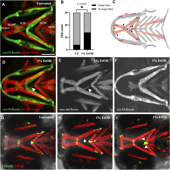 Ethanol induces ectopic muscle fibers (A) Ventral view of branchial skeleton and muscle in untreated sox10:Kaede;unc:mCherry fish at 4dpf. (D–F) Ethanol-exposed