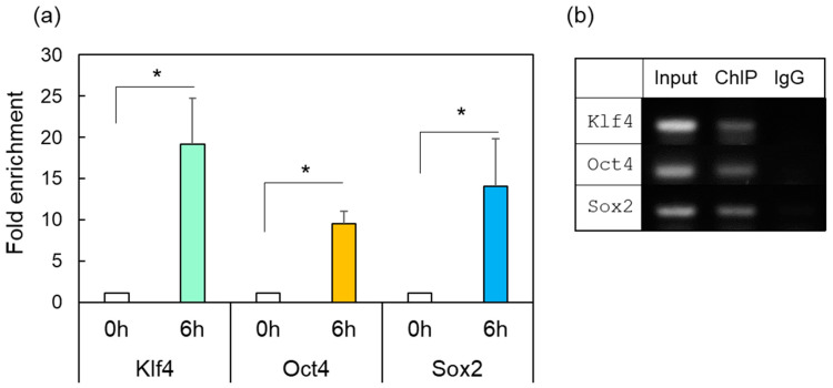 ChIP-enriched DNA was prepared using preimmune serum (IgG) or anti-HSF1 antibody from the control (0 h) or damaged zebrafish retina after ONI (6 h). (a) The immunoprecipitated DNA of Klf4, Oct4, and Sox2 were analyzed by real-time PCR. Each ChIP signal was divided by the no-antibody signals (IgG), representing the ChIP signals as the fold increase in signals relative to the background signals. (b) Gel electrophoresis image using the ChIP samples. The input was used as an internal positive control for the ChIP assay. Five to six experiments were repeated with different retinas under each experimental condition. Data are expressed as the mean ± SEM of independent experiments and analyzed by one-way ANOVA, followed by Scheffe’s multiple comparisons. Statistical significance was set at * p < 0.05.
