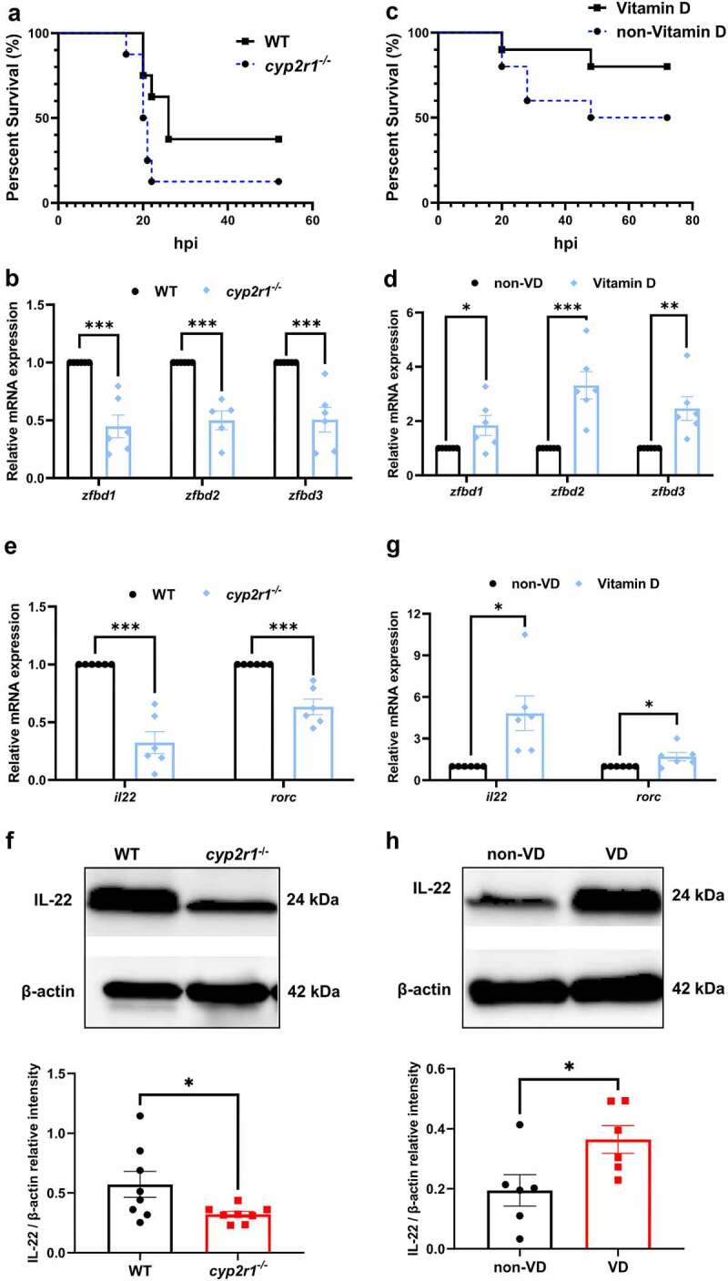VD strengthened the intestinal health and antimicrobial responses in zebrafish. (a) WT and cyp2r1-/- zebrafish at 3 mpf were i.p. injected with 107 CFU E. tarda per fish. The survival rate of each genotype was recorded as survival rate curves (n = 8/genotype). (b) The gene expression of zfbd1, zfbd2, zfbd3 in the intestine of WT and cyp2r1-/- zebrafish was analyzed by qRT-PCR. (c-d) Zebrafish at 2 mpf were fed with the diet containing 0 or 800 IU/kg VD3 for 4 weeks. Thereafter, zebrafish were i.p. injected with 106 CFU E. tarda per fish (n = 10/group), and the survival rate of each genotype was recorded (c). Furthermore, the gene expression of zfbd1, zfbd2, zfbd3 in zebrafish intestine was analyzed (d). (e-f) The gene expression of il22 and rorc (e), as well as the protein level of IL-22 (f) in the intestine of WT and cyp2r1-/- zebrafish was assessed. In addition, (g-h) the gene expression of il22 and rorc (g), and the protein level of IL-22 (h) in the zebrafish fed non-VD or VD-containing diet was analyzed. The images are representative of the results from western blots. *p < 0.05, **p < 0.01, ***p < 0.001. WT, wild type; zfbd, zebrafish β-defensin. See also Figures S1.