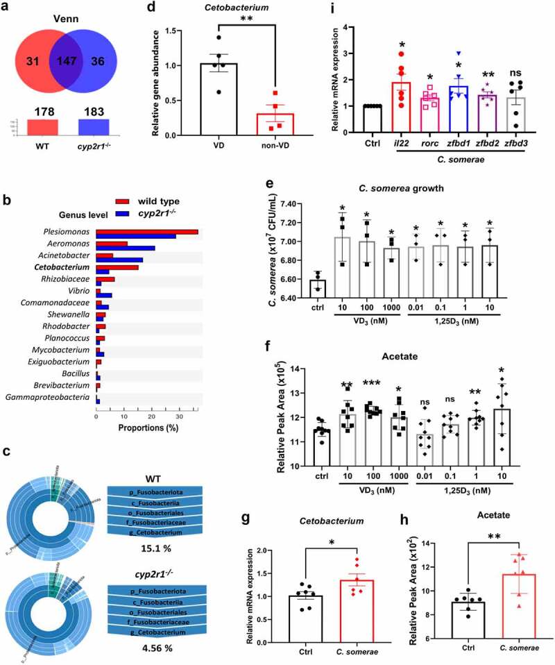 VD influenced the abundance of Cetobacterium spp. in gut microbiota of zebrafish. (a) Venn diagram of exclusive and shared OTUs-level phylotypes (at ⩾97% sequence identity) in WT and cyp2r1 mutant zebrafish (n = 4/genotype). (b) The relative abundance of gut microbiota at the genus level in WT and cyp2r1 mutant zebrafish was analyzed. (c) The pie chart from the inner circle to the outer circle visually exhibited the proportion and distribution of multi-level species in WT and cyp2r1-/- zebrafish at the phylum, class, order, family, and genus levels in turn (n = 4/genotype). (d) Intestinal microbial genomic DNA was extracted from zebrafish fed with 0 or 800 IU/kg VD3 diets for 4 weeks, the abundance of Cetobacterium spp. in the intestinal microbiota was further measured by qRT-PCR using specific primers for Cetobacterium spp. Meanwhile, gene copies of universal bacteria in zebrafish intestine were measured by using eubacteria primers for the normalization. (e-f) C. somerae was cultured in vitro for 8 hours in the presence of different concentrations of VD3 or 1,25(OH)2D3. The growth of C. somerae was calculated (e), and acetate concentrations in the cultures of C. somerae were measured by GC-MS. Results were calculated combined from 3 independent experiments (f). (g-i) Zebrafish at 3 mpf were treated by antibiotics mixture for one week, followed by rearing in the water with or without C. somerae (1 × 105 CFU/ml) for another week. Thereafter, the abundance of Cetobacterium in gut (g), acetate concentration in serum (h), and the gene expression of il22, rorc, zfbd1, zfbd2, zfbd3 in gut (i) was analyzed (n = 6/group). *p < 0.05, **p < 0.01, ***p < 0.001. See also Figures S4.
