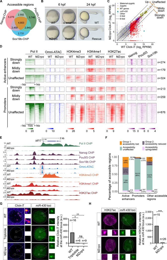 (A) Venn diagram showing significant overlap of NPS binding at all accessible regions (P < 1×10−100 Fisher’s exact test). (B) Micrographs of zebrafish embryos. At 6 hpf, wild-type (WT) embryos develop to the shield stage, while MZnps embryos arrest at the sphere stage and resemble those treated with α-amanitin (a Pol II inhibitor). Co-injection of nanog and pou5f3 mRNAs (Rescue) rescues development of MZnps embryos at 6 hpf and 24 hpf. (C) Biplots comparing nascent transcriptomes of MZnps and WT embryos using Click-iT-seq. (D) Heatmaps showing NPS binding, Pol II binding, Omni-ATAC, and H3K4me1, H3K4me3, and H3K27ac levels at N/P/S-bound active enhancer and promoter regions of zygotic genes. Heatmaps are centered at TSSs (promoters) or Omni-ATAC peak summits (active enhancers). Regions are ranked by the average Pol II binding signal within 1kb of the TSS of associated zygotic genes in WT embryos. (E) Representative genome tracks of Pol II binding, NPS binding, accessibility (Omni-ATAC), and H3K4me1, H3K4me3, and H3K27ac levels in WT and MZnps embryos. The dashed box highlights the klf17 promoter, which remains accessible in MZnps embryos. (F) Stacked bar plot showing the percentage of differentially affected accessible chromatin regions in MZnps embryos compared to WT. (G-H) Left: Confocal imaging showing the miR-430 locus with nascent transcription using Click-iT imaging (G) or H3K27ac immunofluorescence (H) in WT and MZnps embryos. Right: quantification of signal at the miR-430 locus. miR-430 was labeled with dCas9-GFP and sgRNAs targeting the locus. Nuclei are outlined with a dashed line based on DAPI signal. Triptolide is a Pol II inhibitor. Scale bar: 5 μm. See also Figure S1.