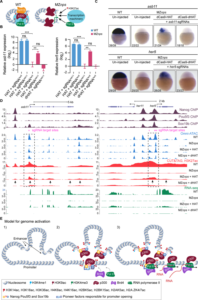(A) Schematic for testing whether recruiting histone acetyltransferase activity can bypass NPS in activating transcription. (B) qPCR analysis showing the relative expression of asb11 and her5, normalized by actb1. When targeted, asb11 and her5 transcription was rescued by dCas9-HAT in MZnps embryos (two-tailed unpaired t-test, ns: not significant, ** P <0.01, *** P <0.001). sgRNAsasb11 injected embryos were used as a control for her5 expression analysis, and vice versa. sgRNAsasb11: sgRNAs targeting asb11. sgRNAsher5: sgRNAs targeting her5. (C) RNA in situ hybridization analysis of asb11 and her5 in wild-type (WT) and MZnps embryos. sgRNA targeting asb11 and her5 were injected separately. (D) Genome tracks showing that accessibility, H3K27ac, and transcription were restored at asb11 and her5 in MZnps embryos by the dCas9-HAT system. Transcription was activated for her11, a gene near her5. Dashed boxes highlight the sgRNA targeting regions. Arrows show regions where H3K27ac is rescued. sgRNA targeting asb11 and her5 were co-injected. (E) Model illustrating the sequence of events of NPS-mediated genome activation. See also Figure S3.